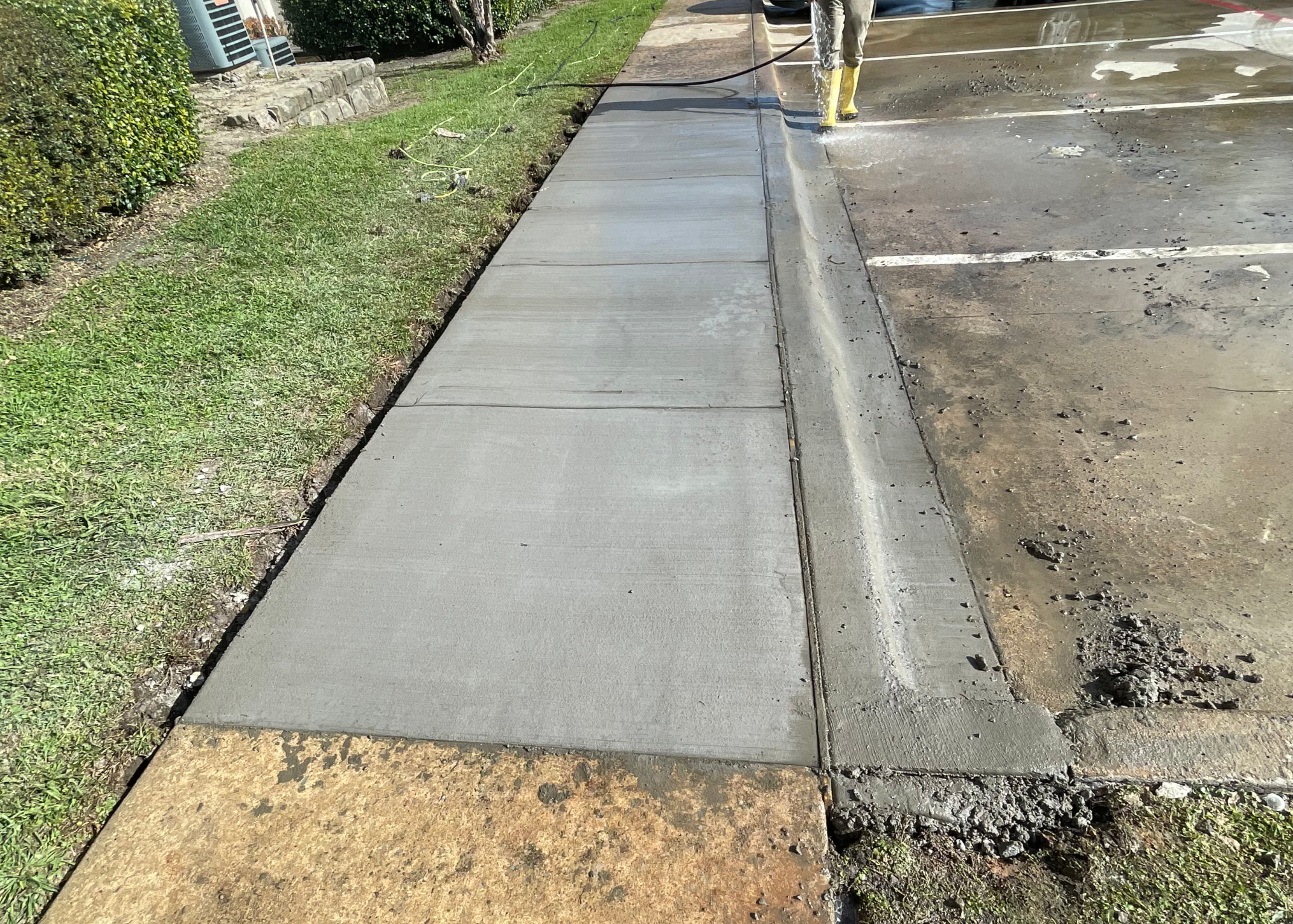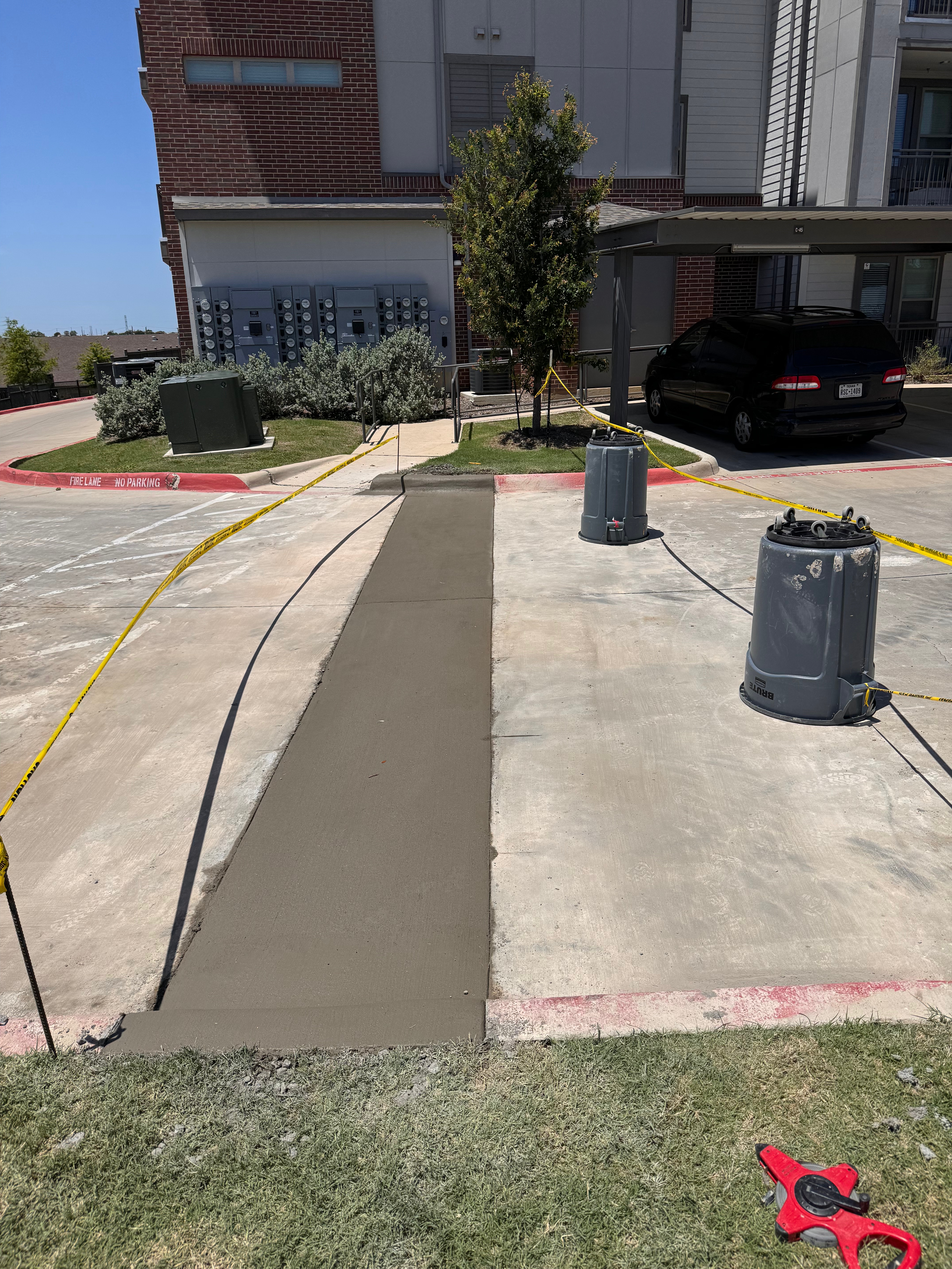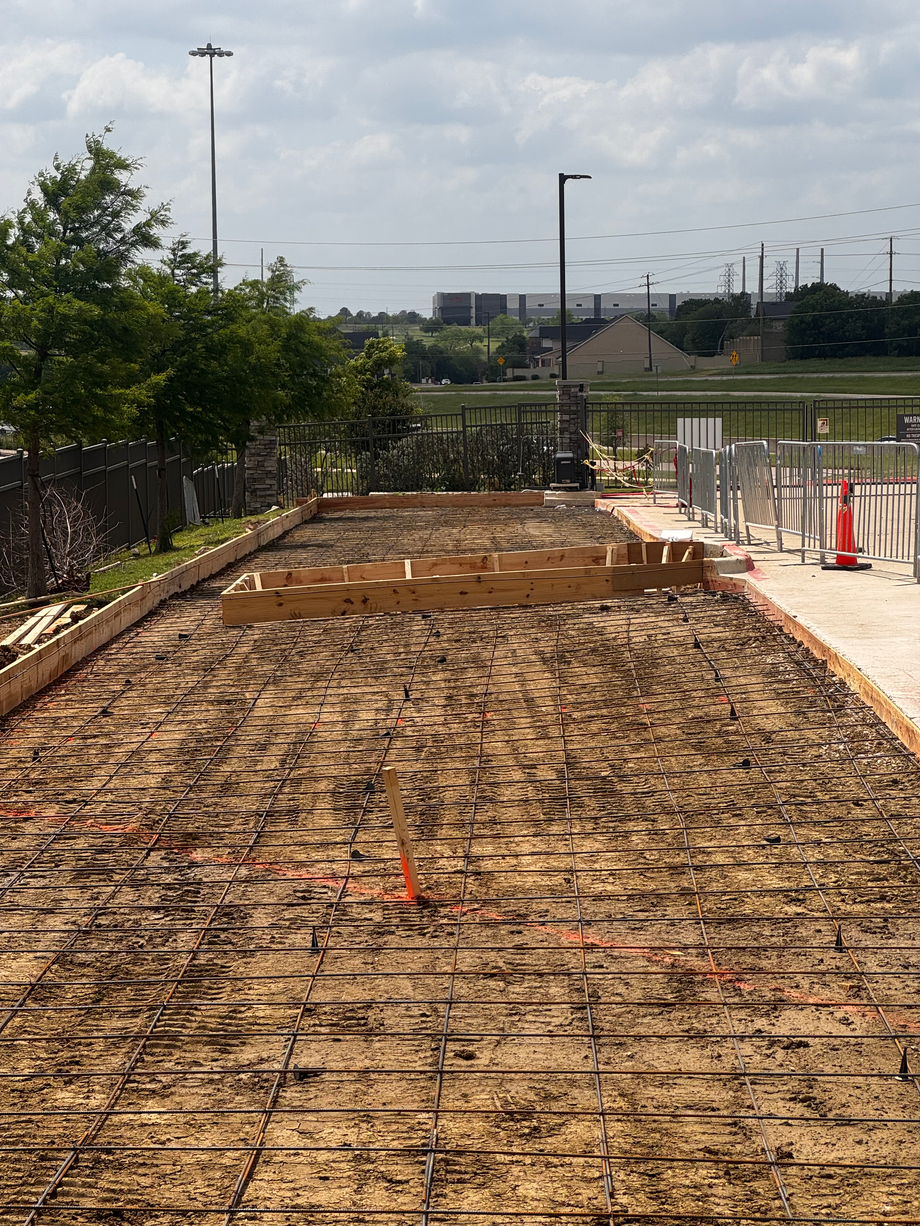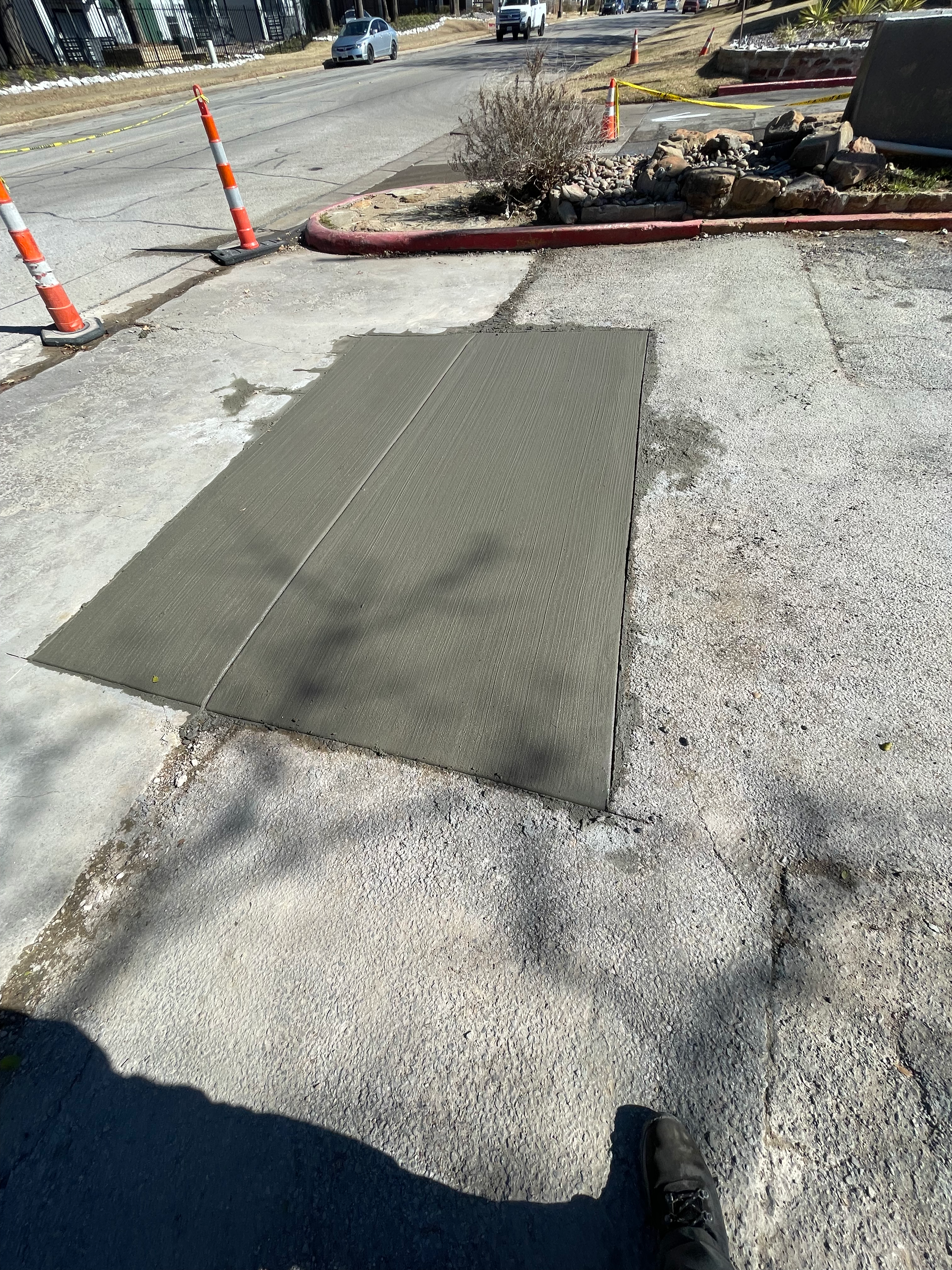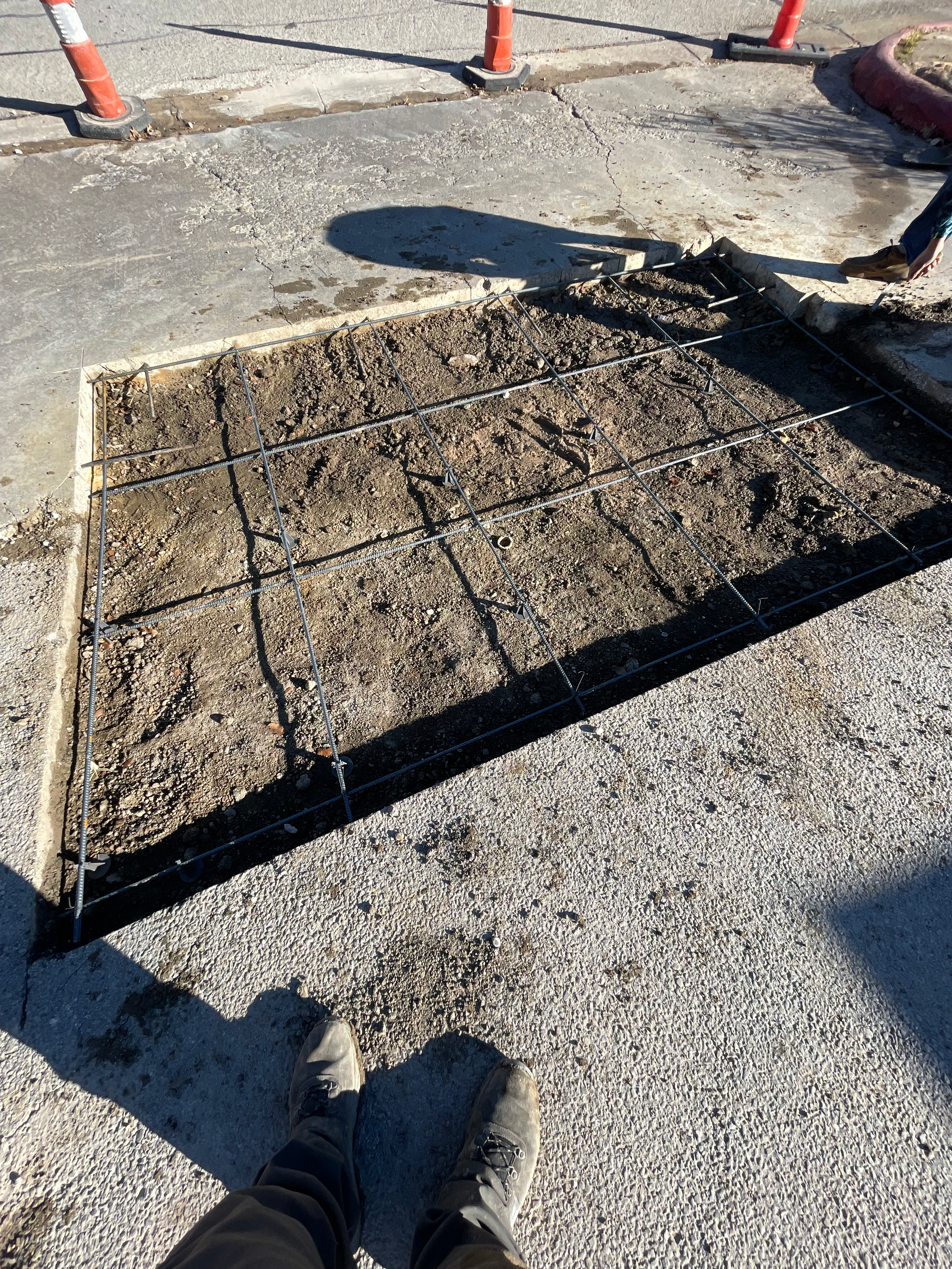 We removed the existing damaged concrete and prepared the area for replacement. Our team installed wood forms, added rebar for reinforcement, and poured new concrete to create a smooth, durable surface. The finished result blends seamlessly with the surrounding parking lot and is built to last.